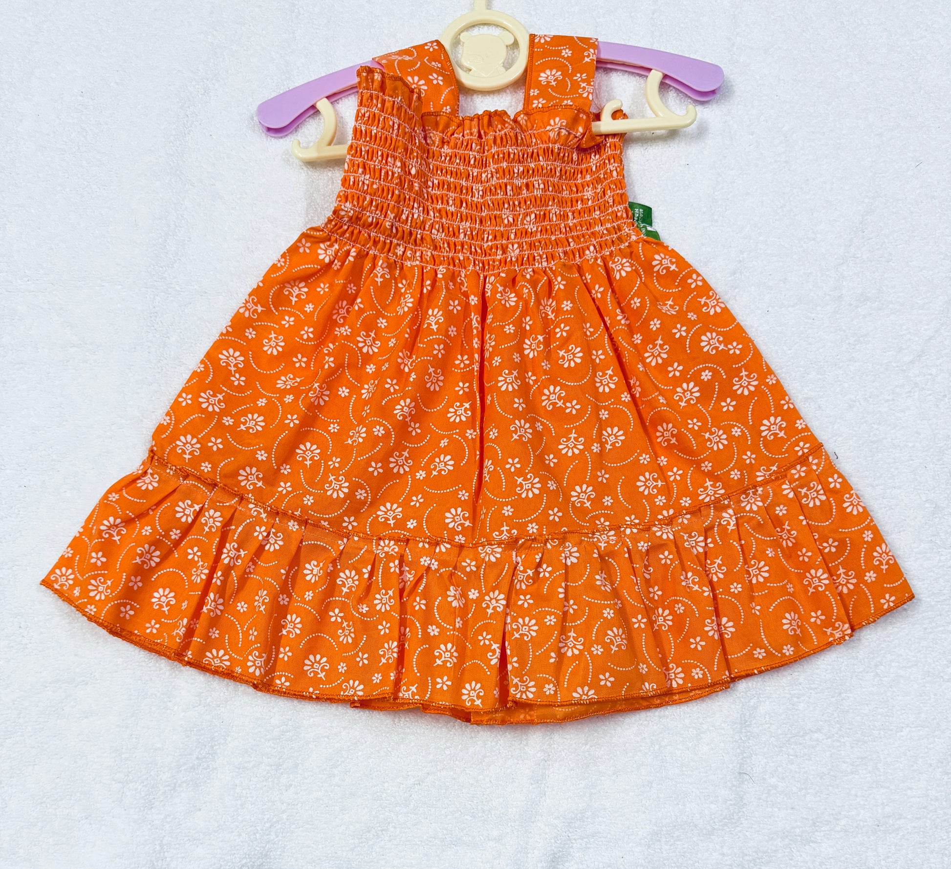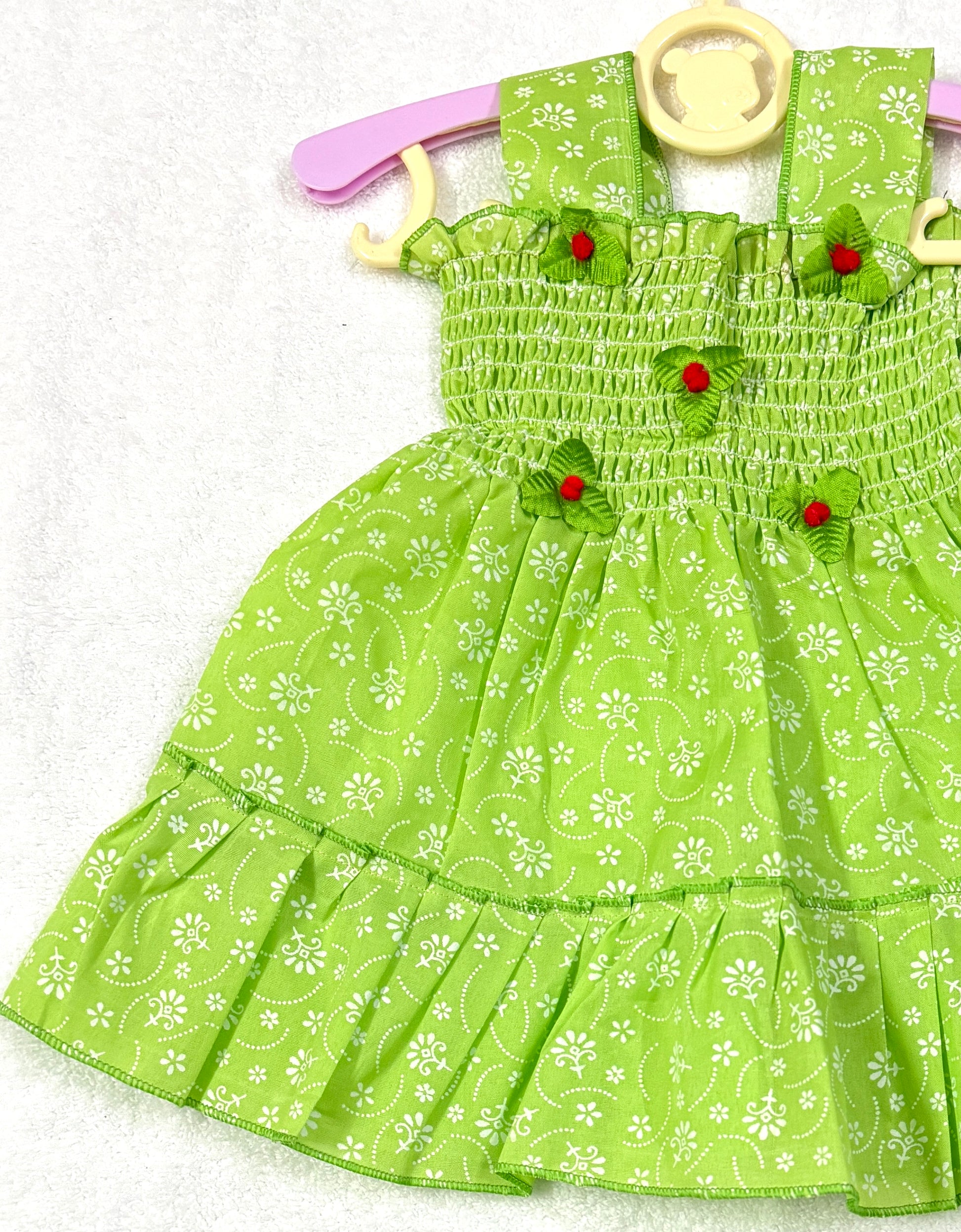 Add a pop of charm to your little one’s wardrobe with this adorable multiple colours baby dress! Perfect for (3-6) months Baby girl, this sleeveless cotton frock features delicate floral prints, soft smocking at the chest for a comfy fit, and cute 3D strawberry leaf accents that add playful detail.