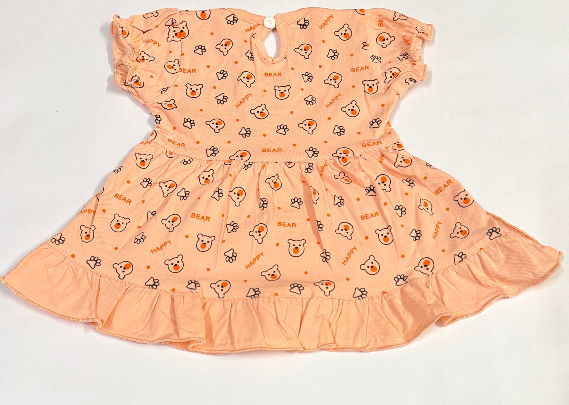 Peach Bear Print Baby Frock Set for Girls – Size S (3–6 Months)