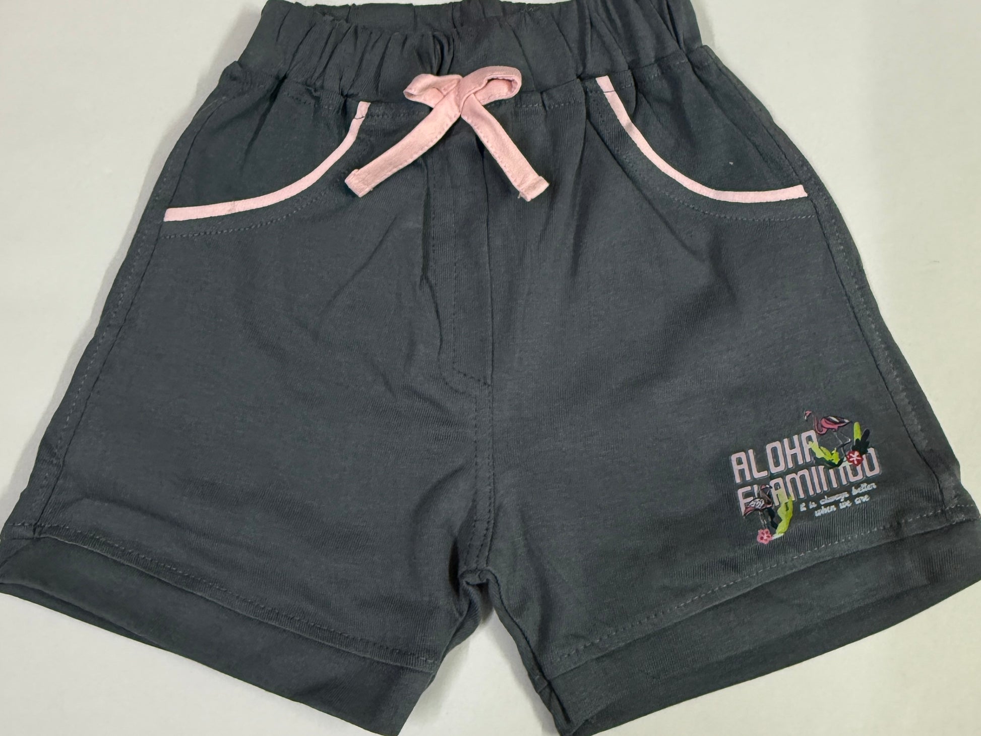 Keep your baby girl cool and cute with this breezy pink and grey summer set, designed for little ones aged 0 to 6 months. The soft pink top features a sweet flamingo print with the words "it is always better when we are," paired with comfy grey shorts that have a decorative bow and printed “Aloha Flamingo” detail. A perfect everyday outfit for sunny days, playtime, or casual outings!