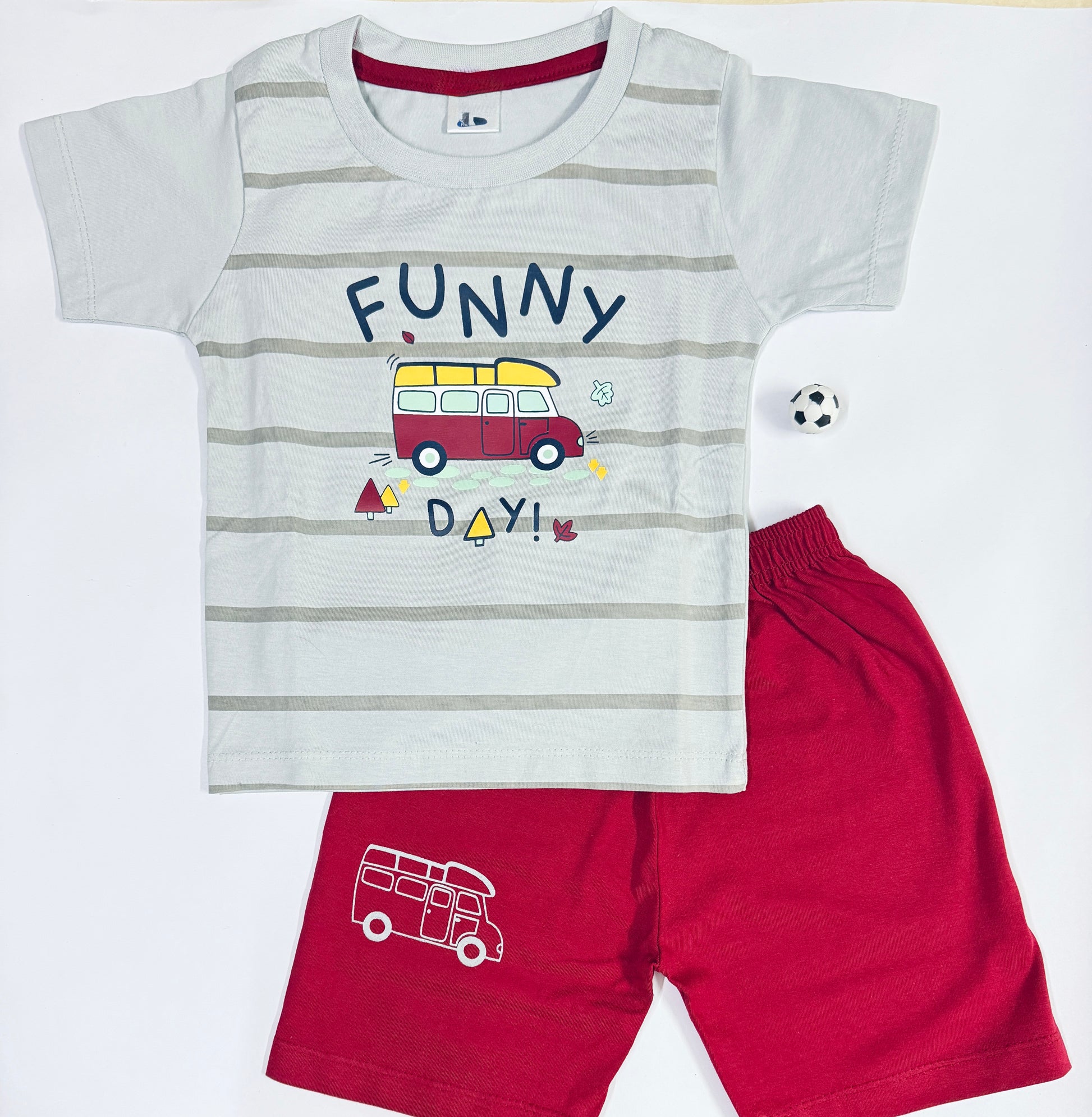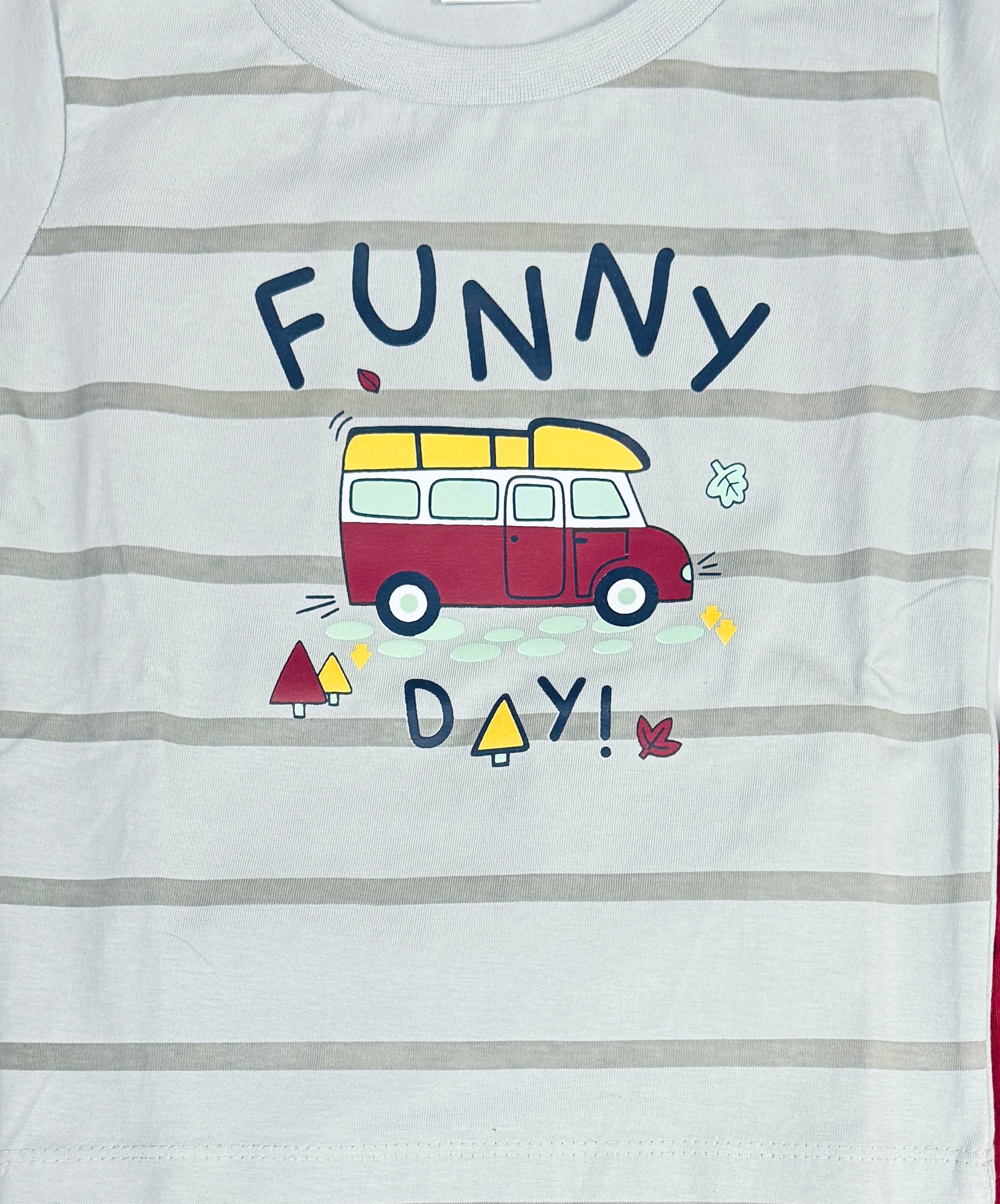 Brighten up your baby boy’s day with the adorable Tiny Trends “Funny Day” T-Shirt and Shorts Set. This cheerful outfit includes a soft, striped t-shirt featuring a fun van print with playful illustrations, paired with comfy red shorts showcasing a matching van motif. Designed with your little one’s comfort in mind, the breathable cotton fabric and elastic waistband make it perfect for everyday adventures and playdates.