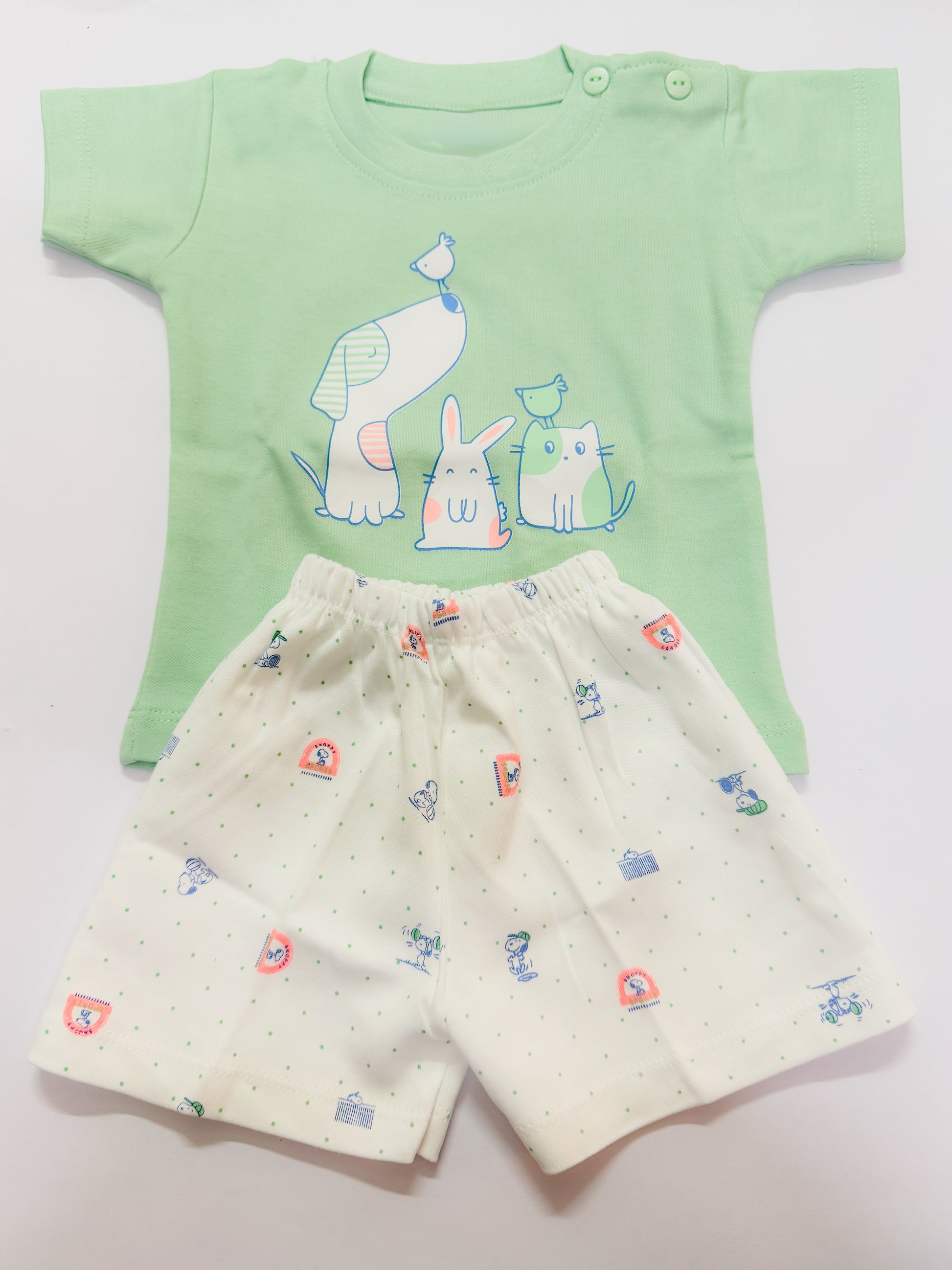Let your baby step out in style and comfort with this sweet and playful Tiny Trends outfit. The pastel green t-shirt features a charming illustration of an animal squad (dog, bunny, cat, and birds), while the soft cream-colored shorts are dotted with whimsical animal motifs and subtle green polka dots. Made from breathable cotton, this outfit is perfect for keeping your baby comfy and cheerful all day.