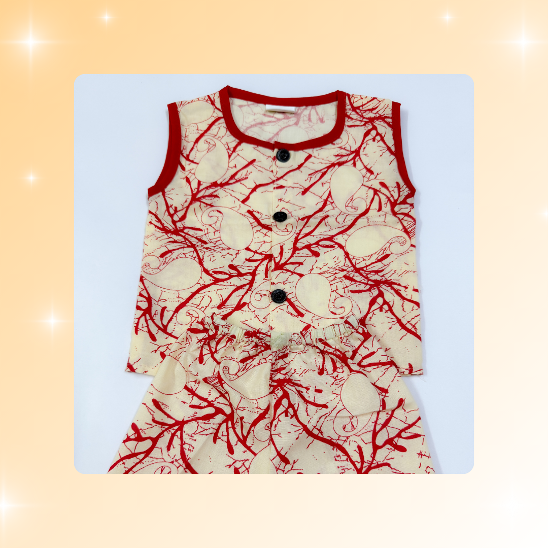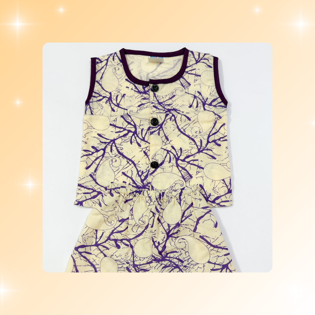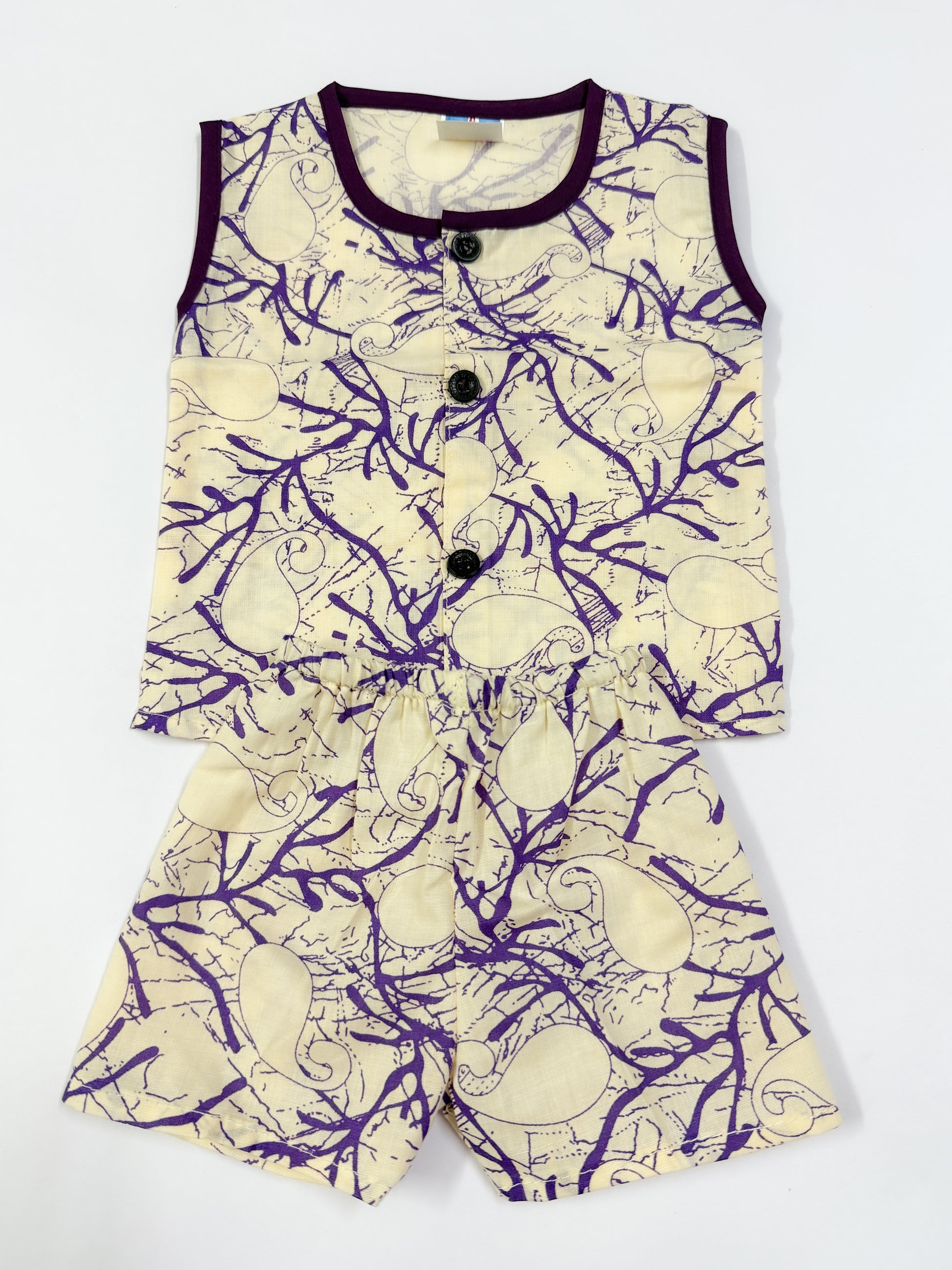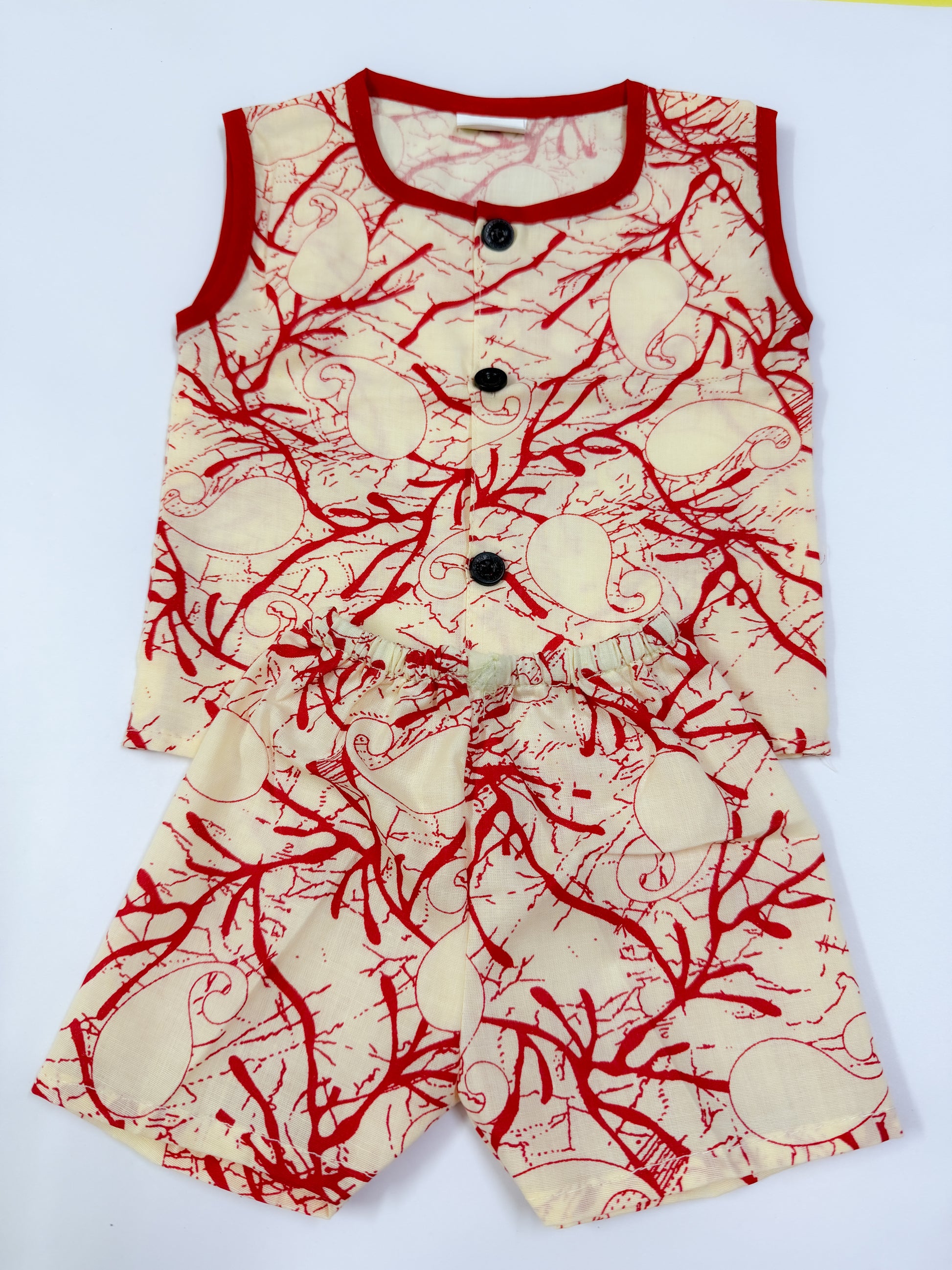 Keep your little one cool and comfy with this vibrant Combo Pack of 3 Baby Vest & Shorts Sets. Each set features a playful, abstract print with traditional Indian paisley and vine motifs in eye-catching red, purple, and green color themes. Made from soft, breathable cotton, these sleeveless vests with front button closures pair perfectly with matching elastic-waist shorts — ideal for summer days, nap time, or casual play.